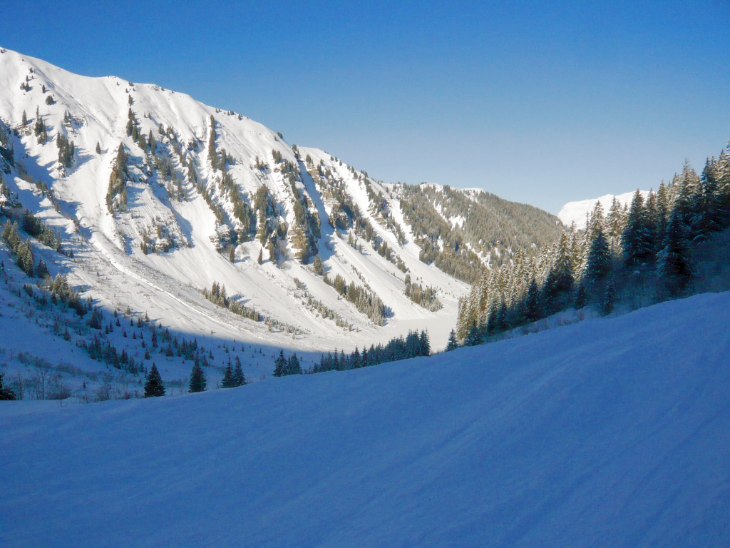 The main run is the black Styx which is quite steep but plenty of terrain to select the best route to the bottom of the drag lift. The drag lift takes you back to the top of the Combe de Gers or if the Cascade run is open (the longest blue run in Europe) then you can ski down to Sixt fer a Cheval and catch the free shuttle bus back to Samoens and cable cars and chair lifts back to Flaine or elsewhere in the Grand Massif. Attached some photos providing views looking both down into the valley and back up the bowl; including the drag lift.