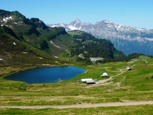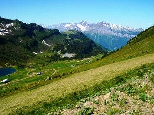 I walked along the path under the Telesiege du Lac ski chair, towards the Lac de Vernant at 1840m. Below is a couple of photos of the lake and the view towards the Route de Flaine and Pointe Percee as I started the climb towards Tete de Saix.